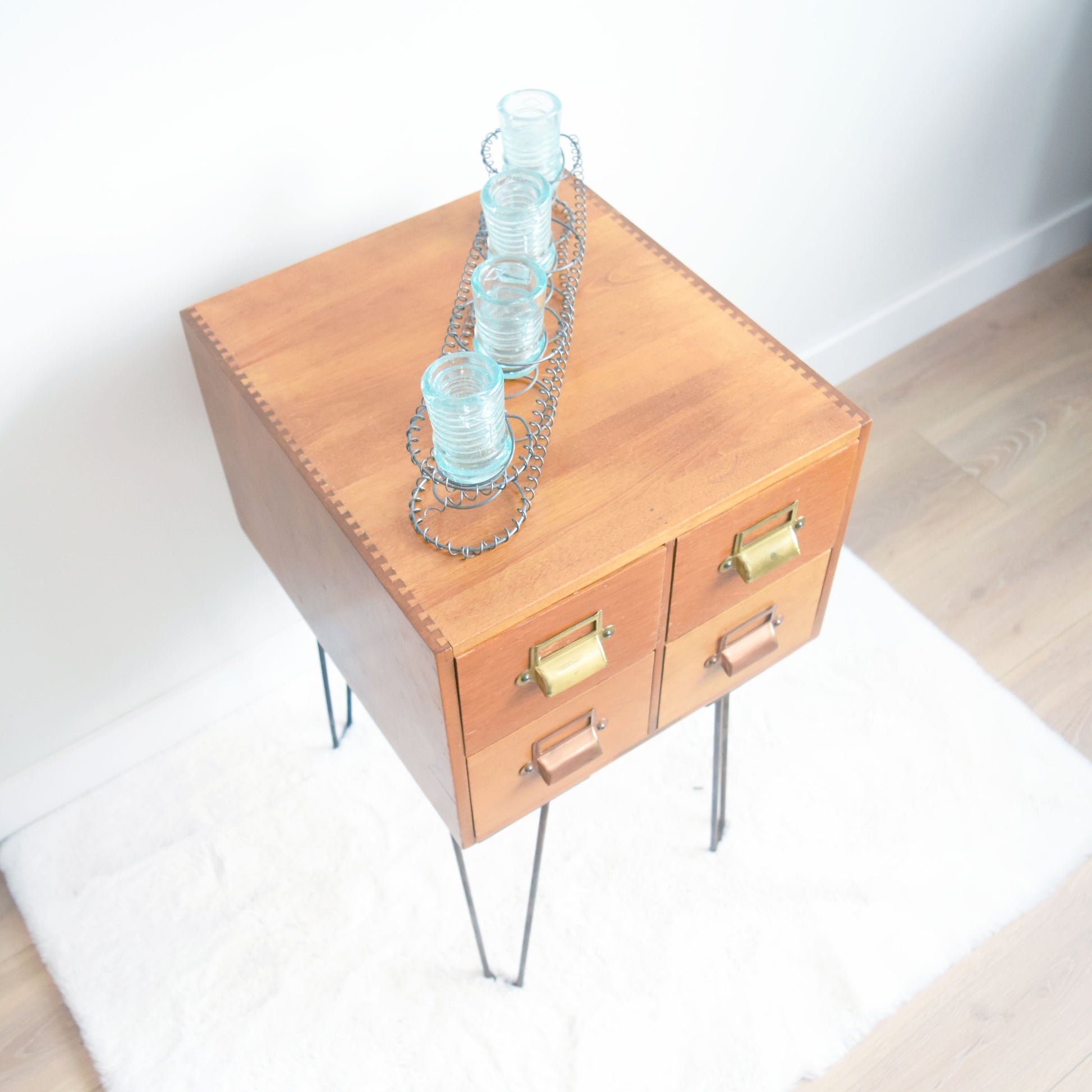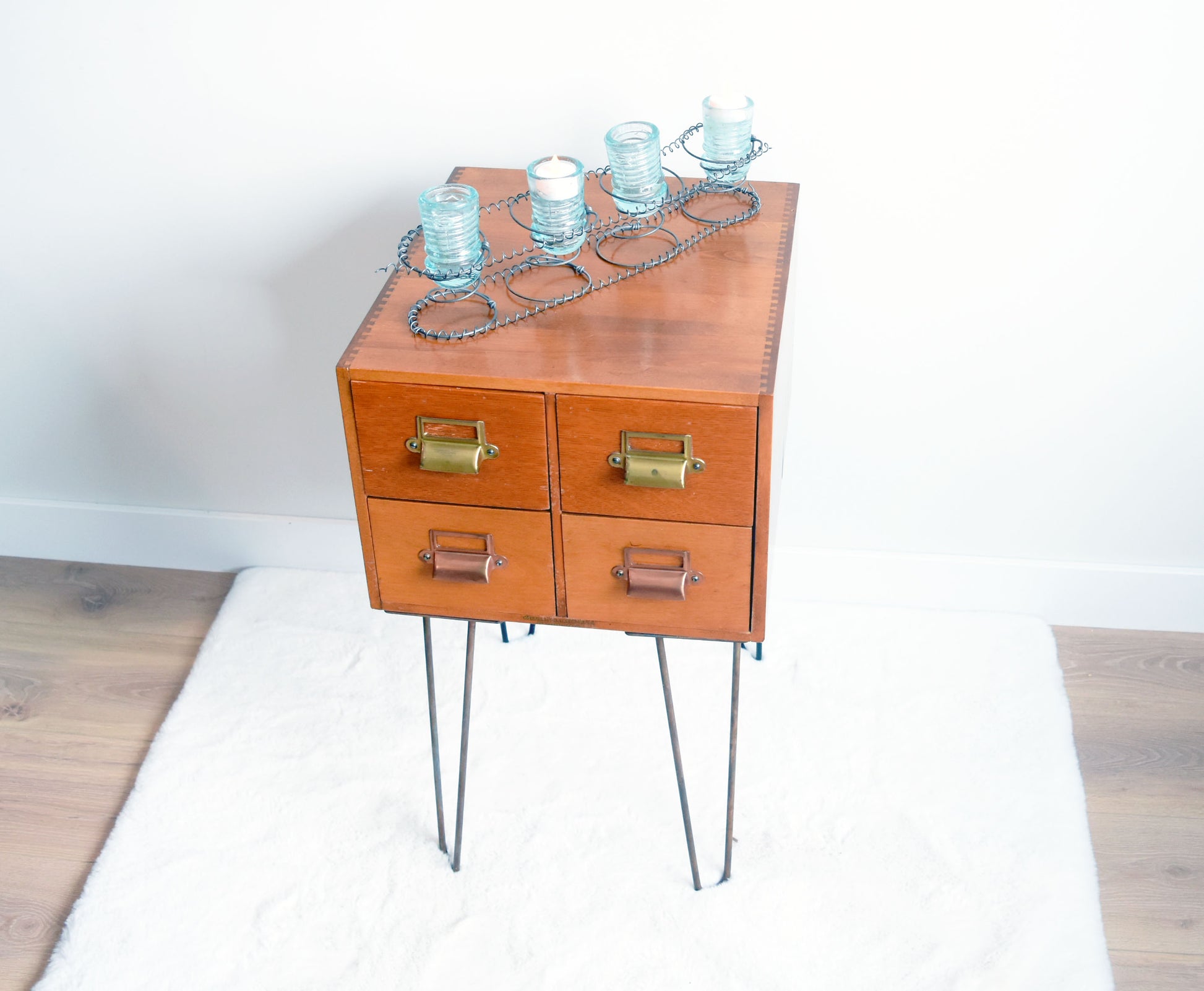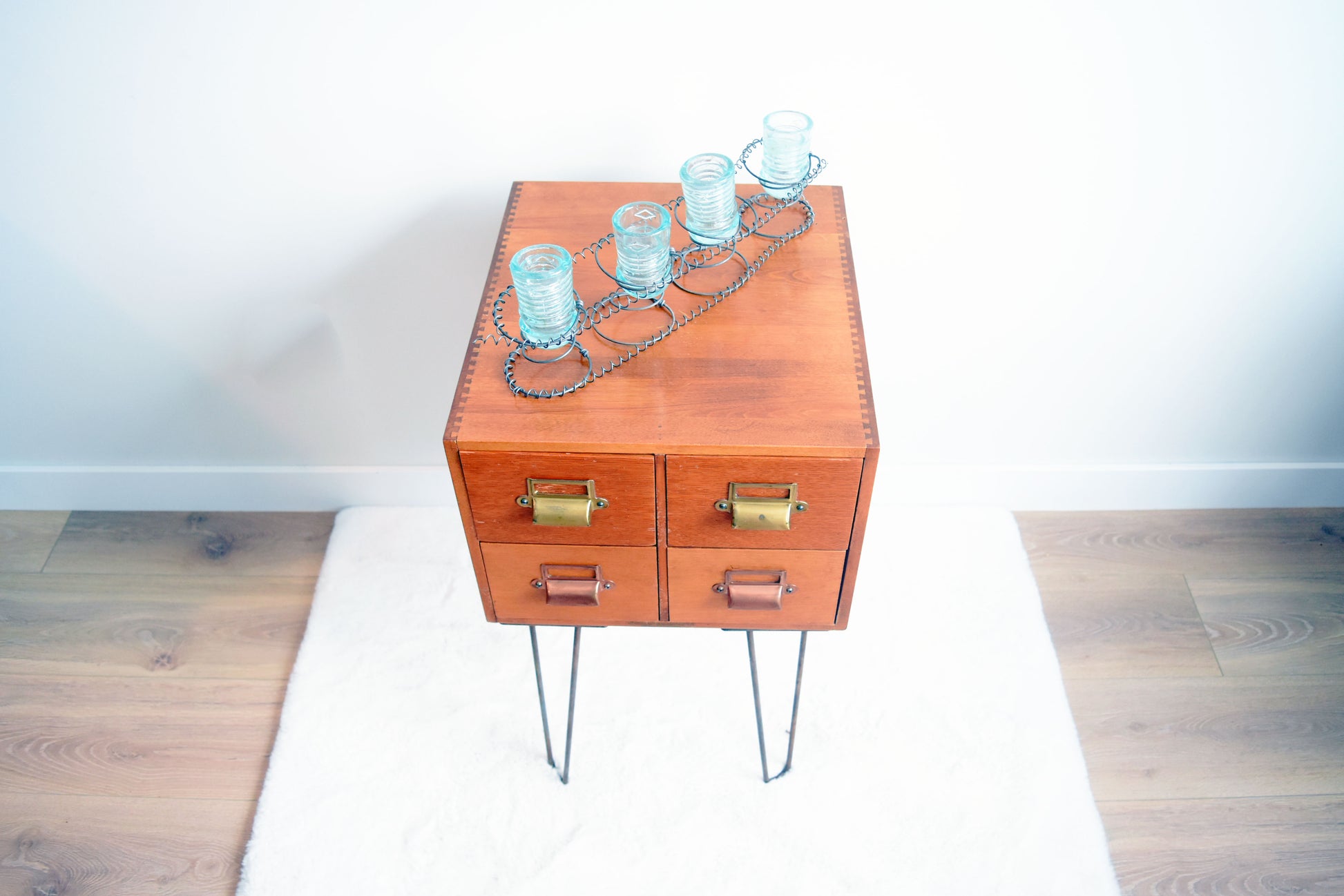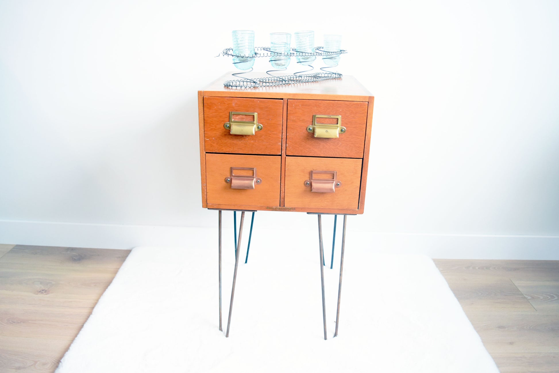 This table is 1 of 3 in a set. The antique iron hairpin legs complement the 4 wooden drawers and copper handles.