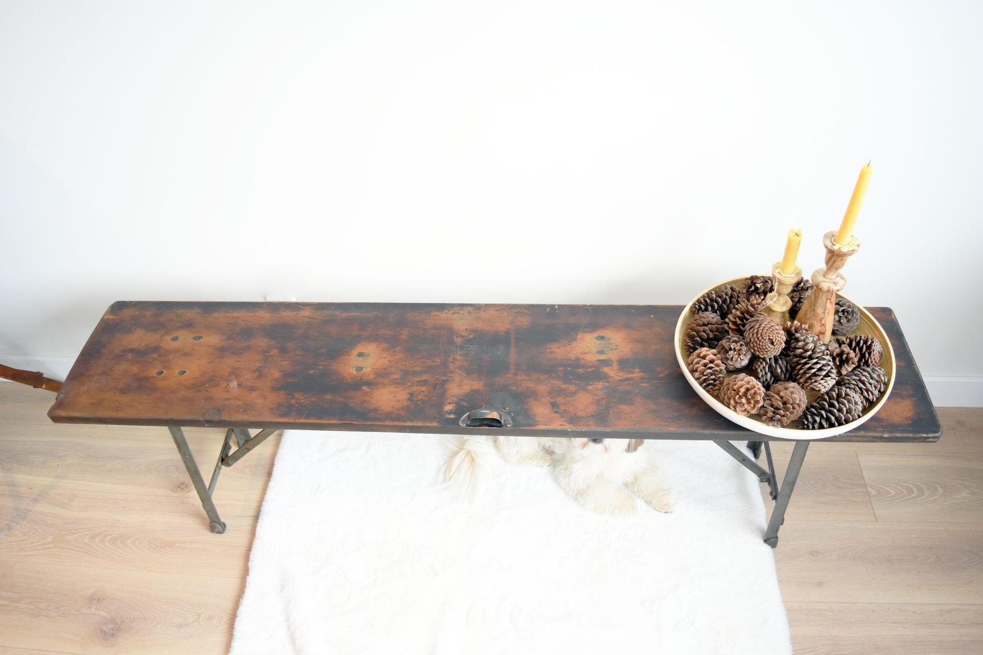 The original top of this 100-year-old baseball bench was too far gone to salvage. We used a cupboard door to bring back to life all the stories both pieces had to tell about life in the baseball diamonds across Alberta.