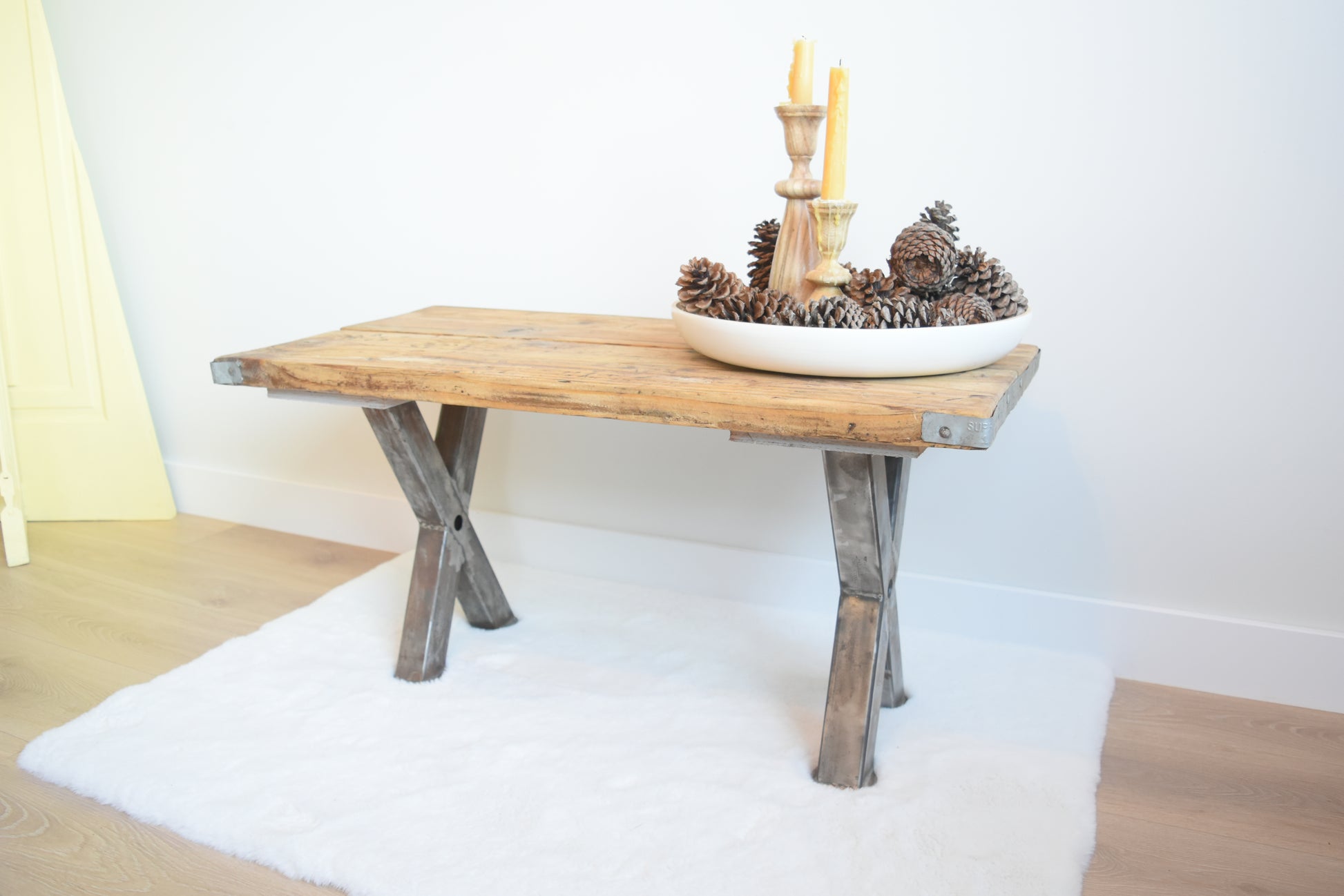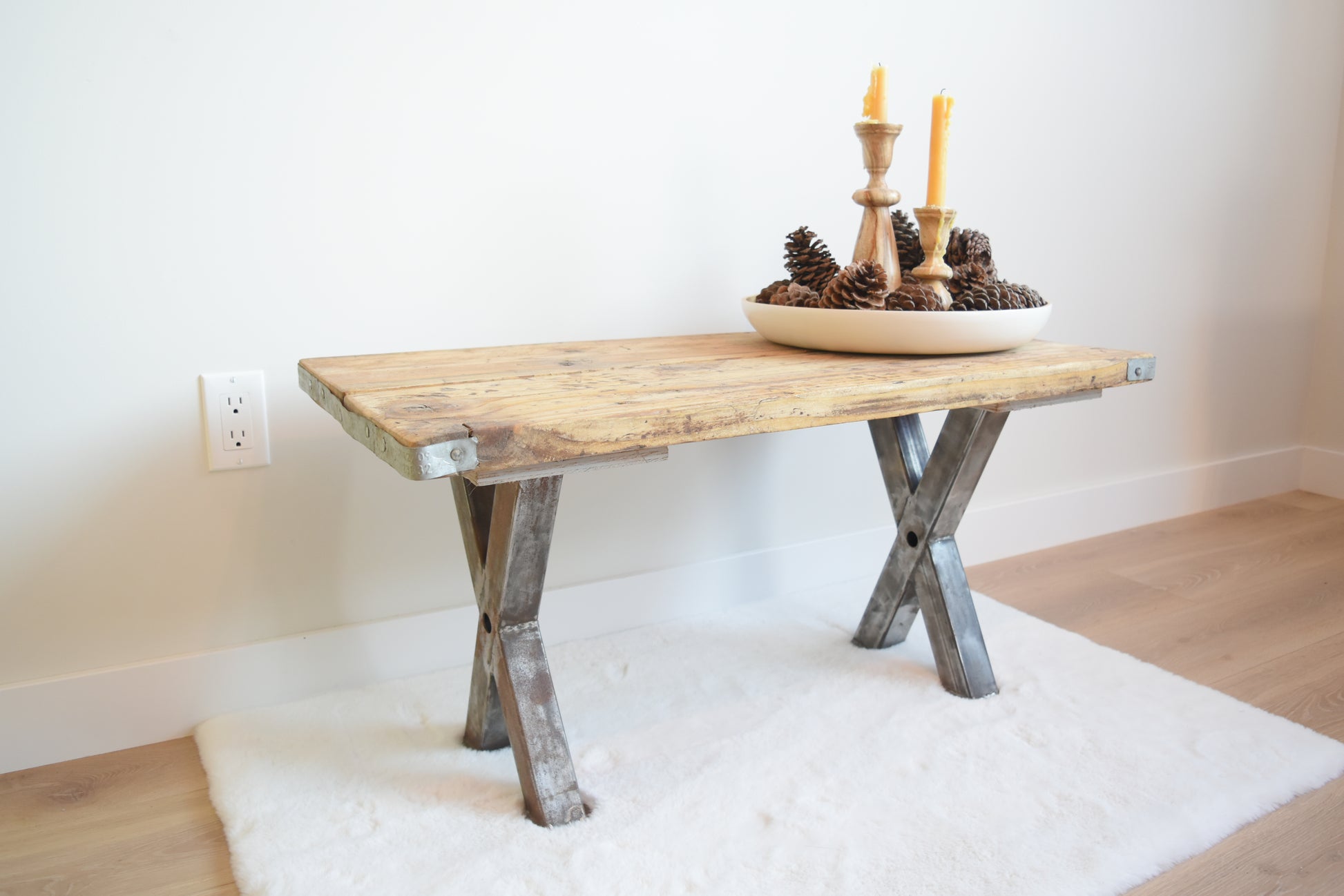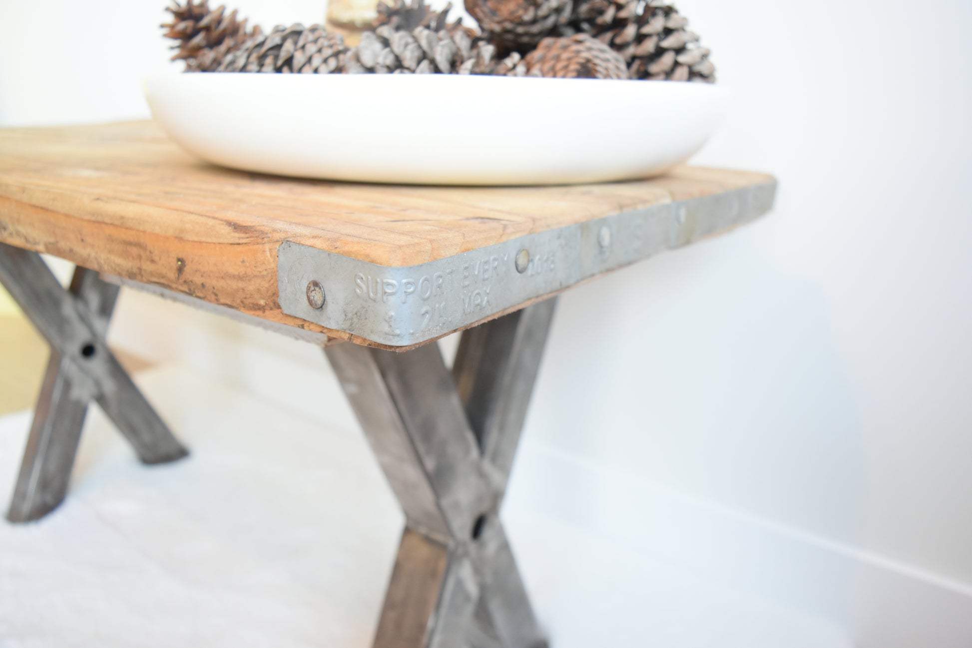 The industrial look of the base of this wooden bench would accent any entrance. Additionally, the size of this unique piece allows for the more versatile placement of this piece of art.