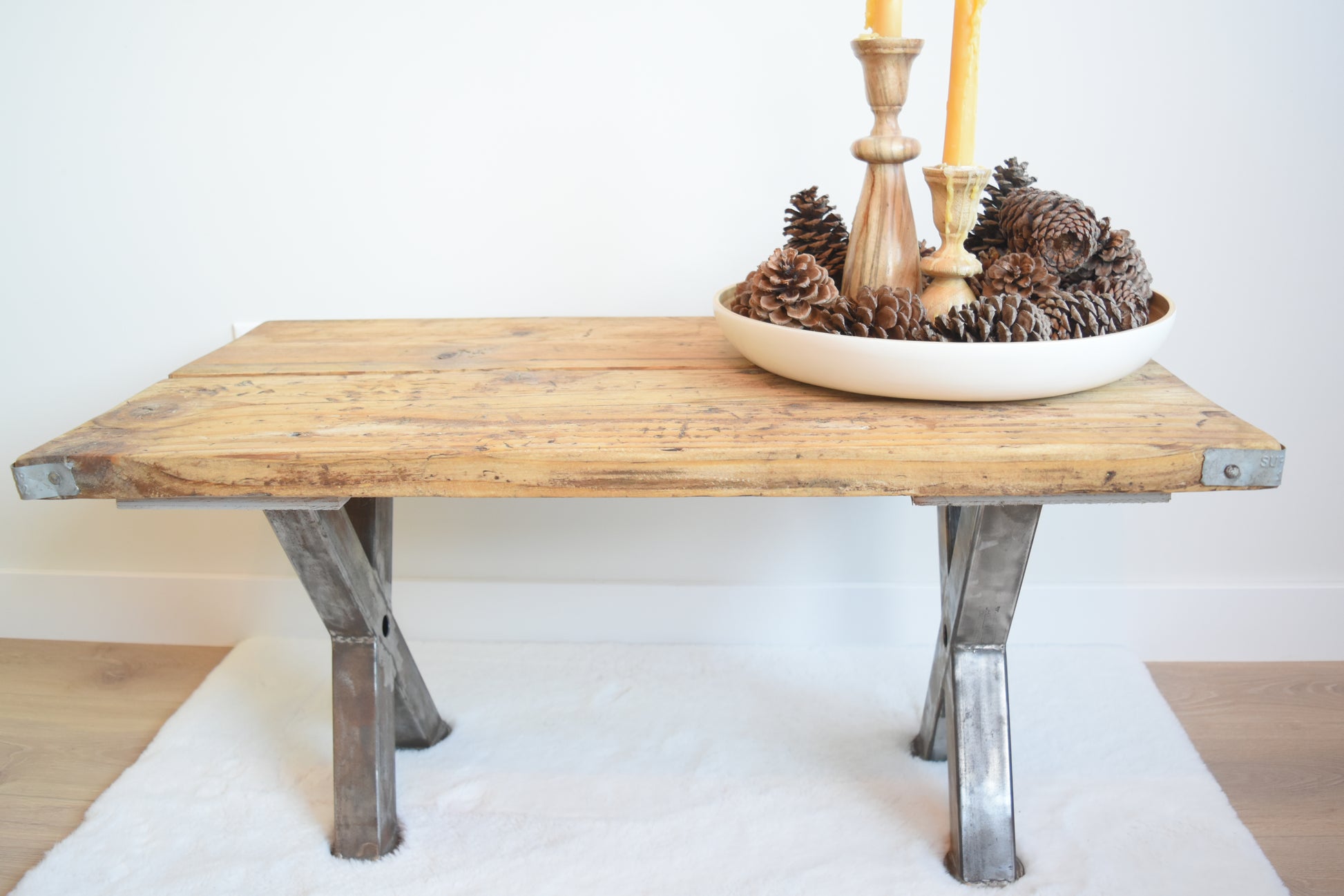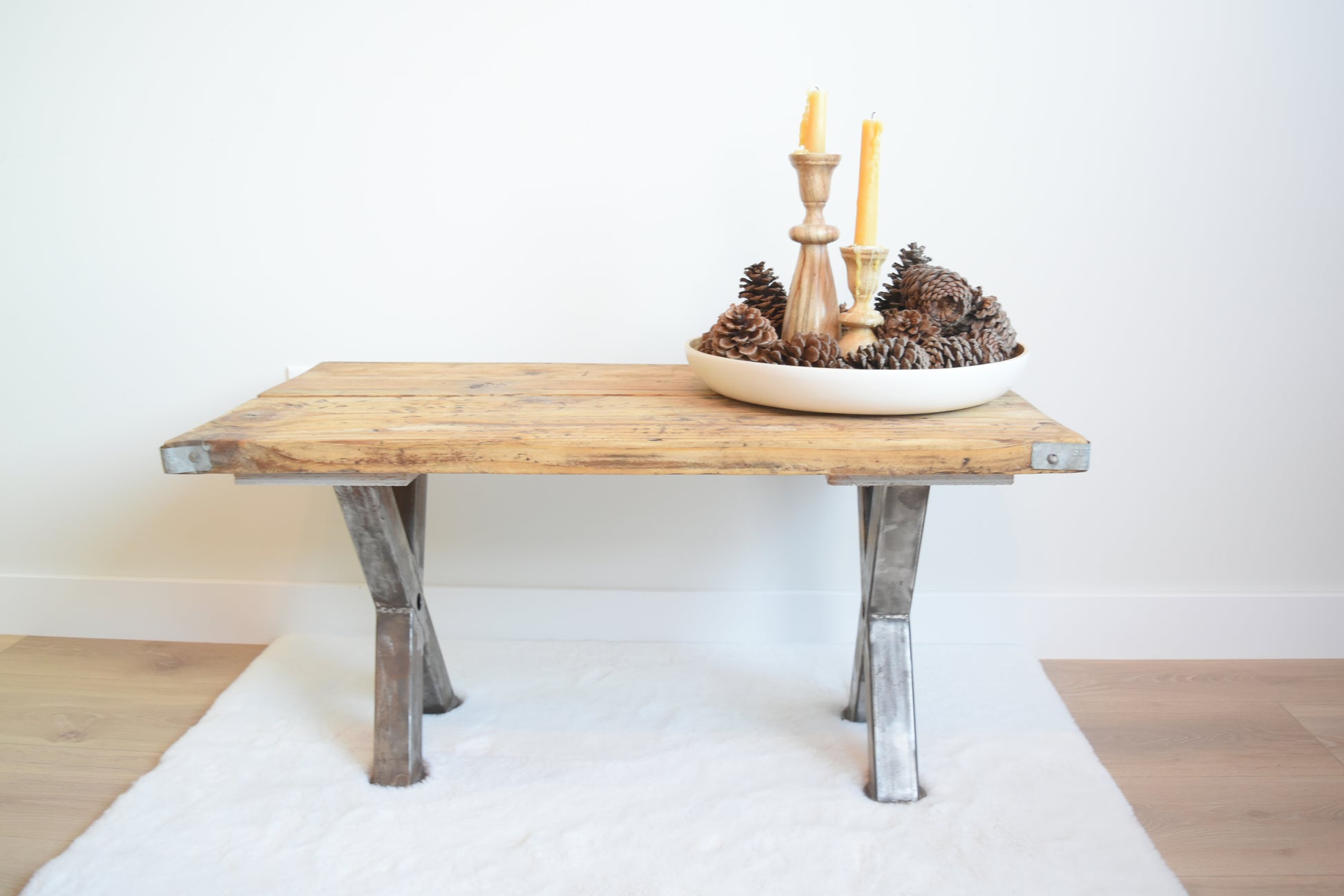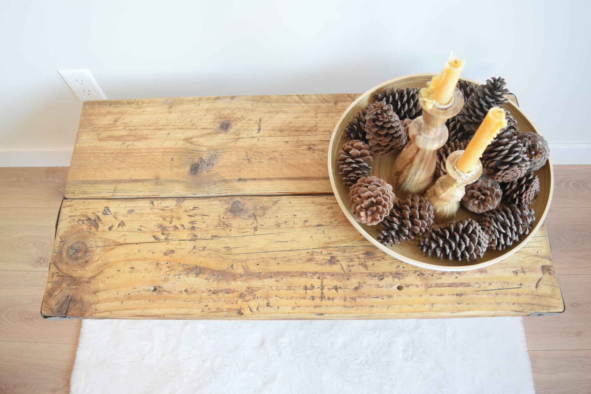 The industrial look of the base of this wooden bench would accent any entrance. Additionally, the size of this unique piece allows for the more versatile placement of this piece of art.