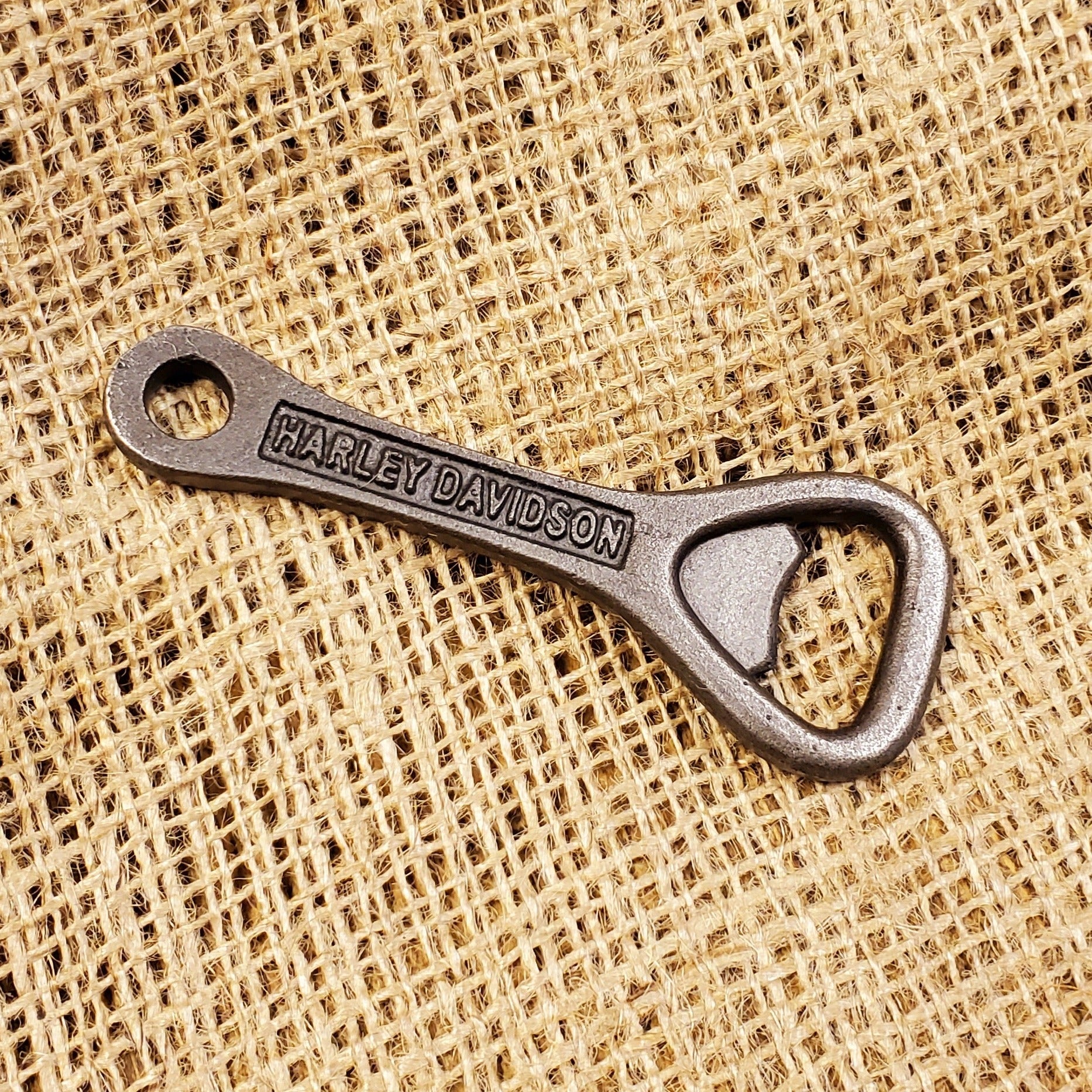 This is a classic antique-style bottle opener has the Harley Davidson name stamped on it. This tough bottle opener will look great in a man cave or on a patio.