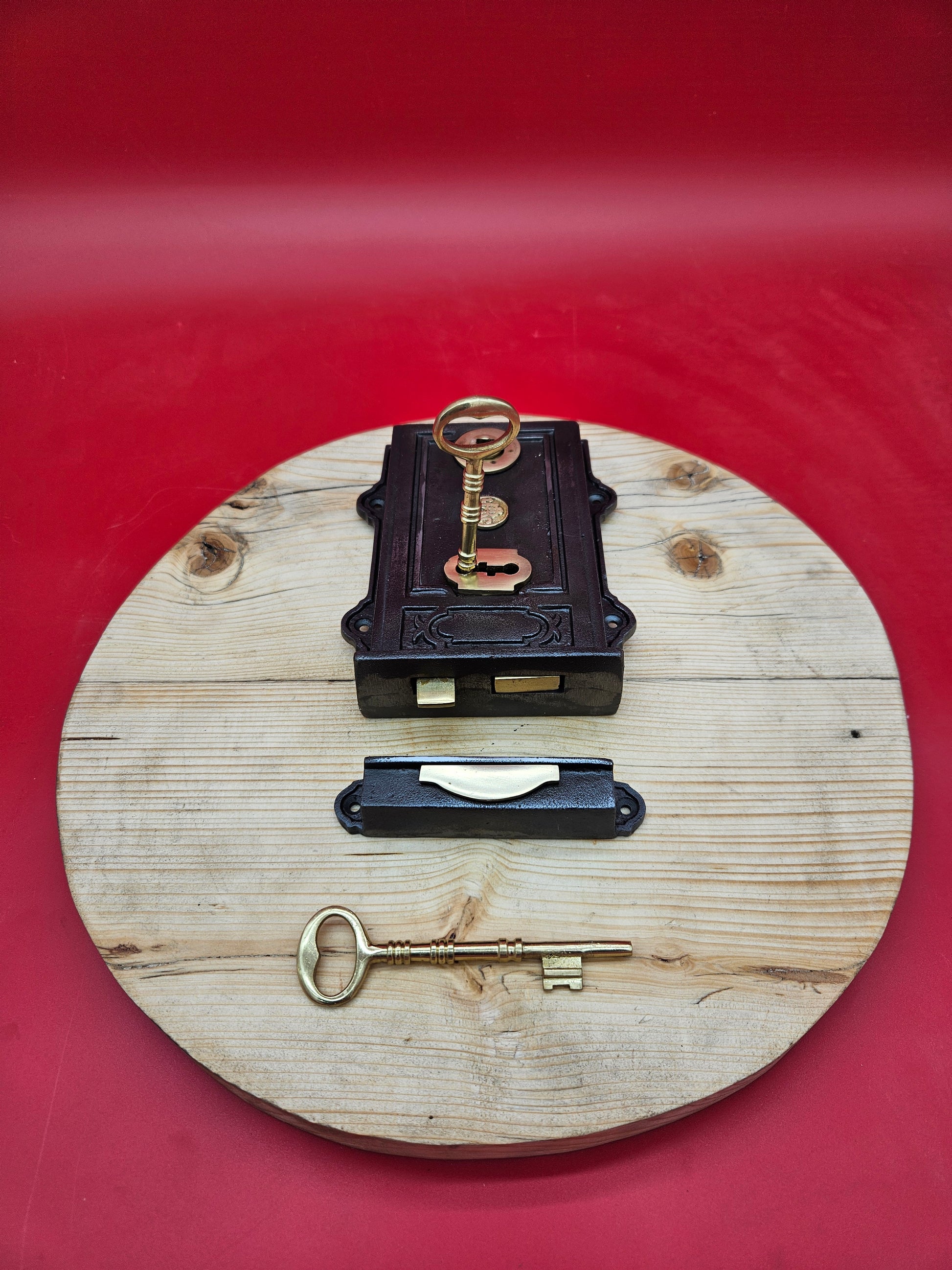 The Davenport Lever Rim Lock. This cast-iron rim lock comes with a Brass Lock and 2 keys and matching Lock Keep(Lock mechanism is reversible) (Door knob set sold separately)