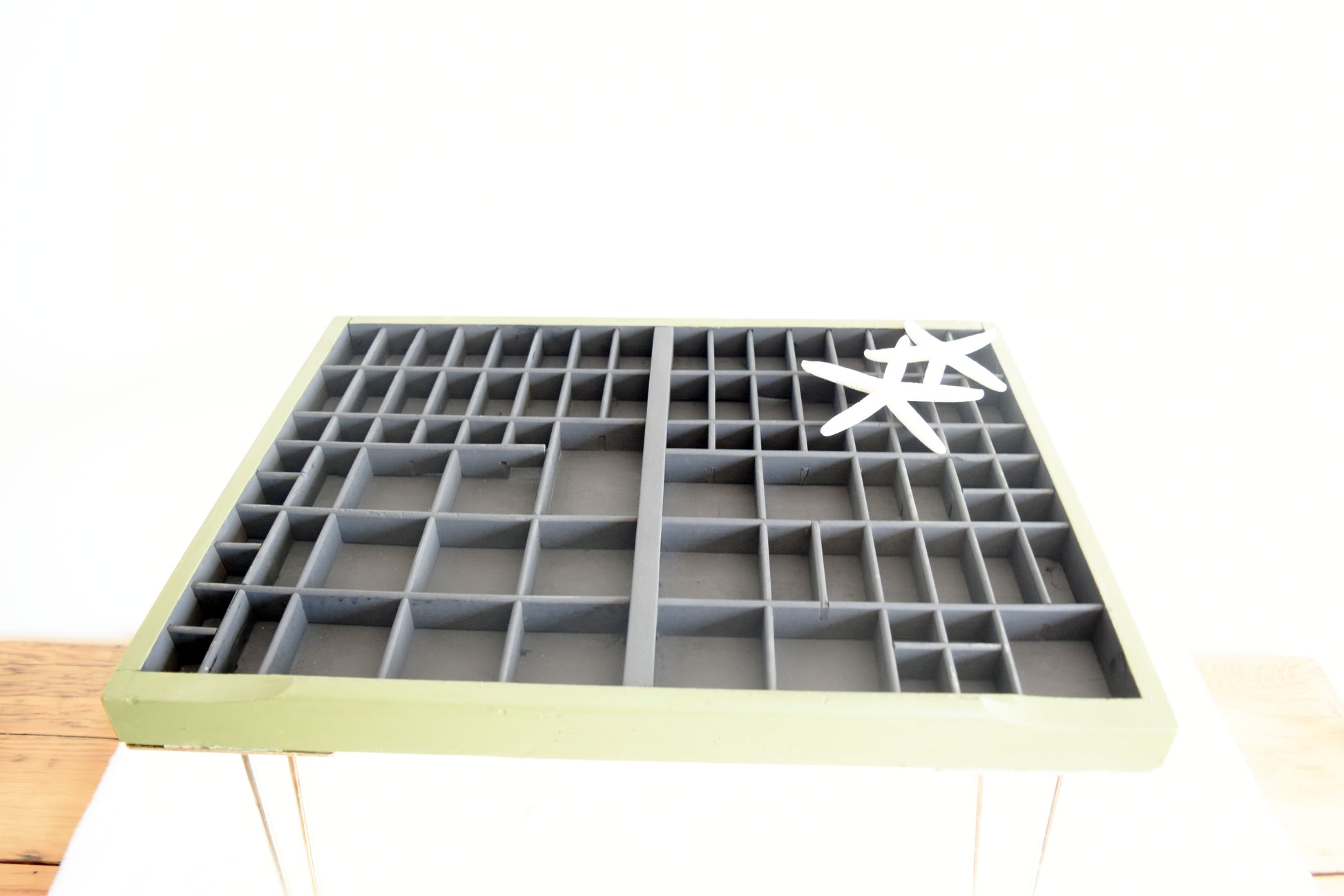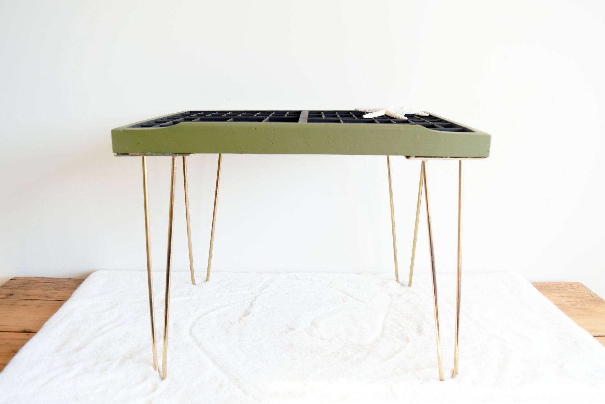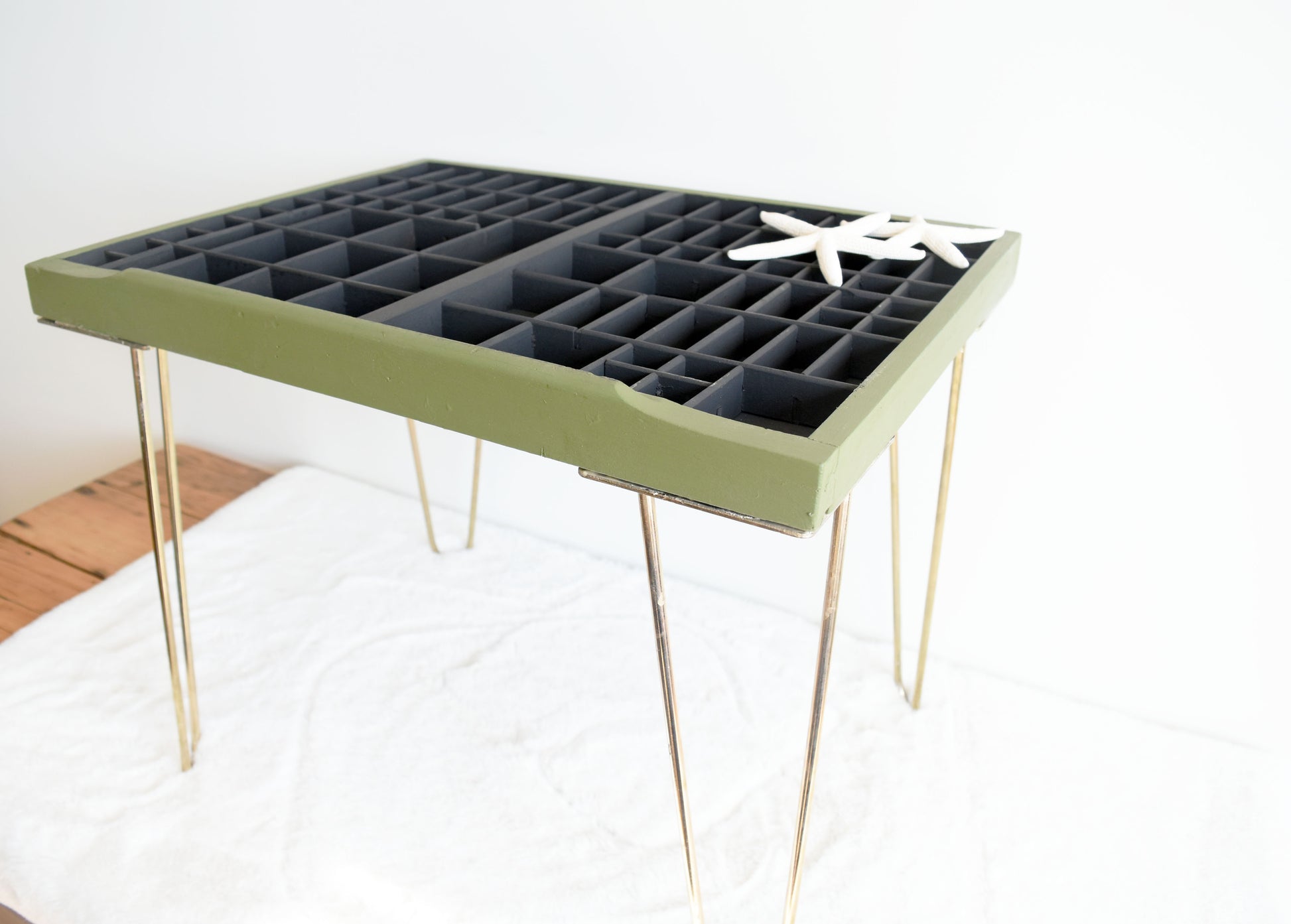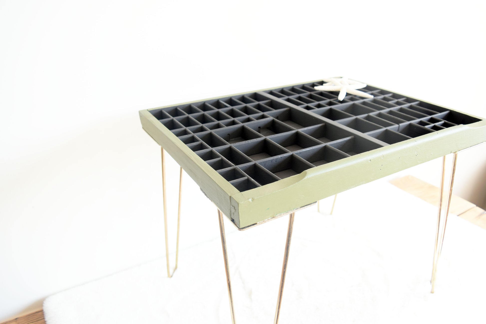 What a wonderful place to store those special shells that your little ones collected along the beaches, lakes and rivers that you enjoyed as a family. The glass top will help store those memories as well. Finally, our wonderful antique brass hairpin legs highlight the wonderful vintage green.