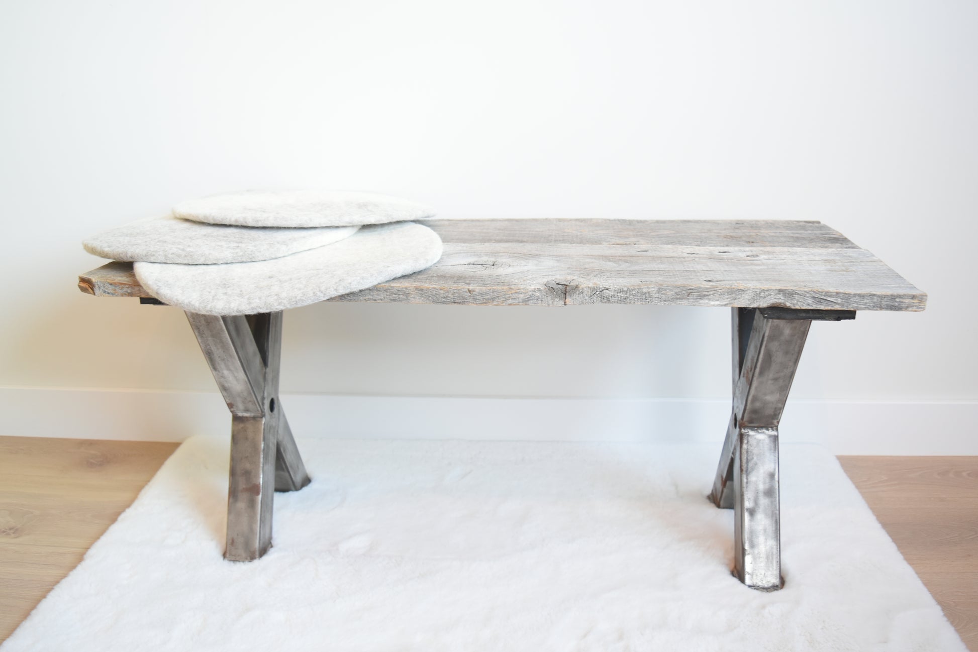Topping the industrial X-shaped legs of this bench is the wonderful weathered look of barn wood. Positioned at your entrance this bench would welcome your guests from the first time they walk through the door. It could also be used as a coffee table.