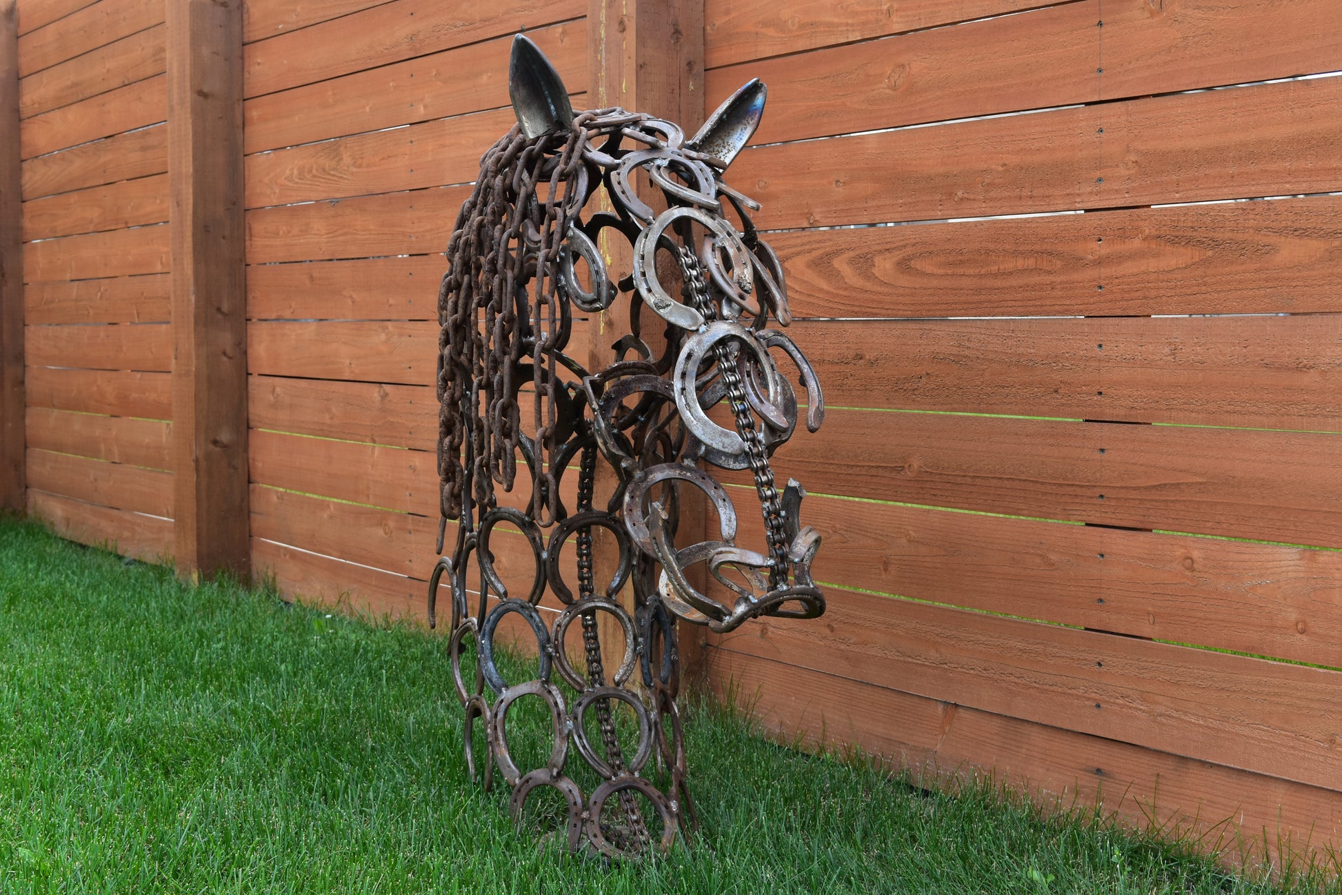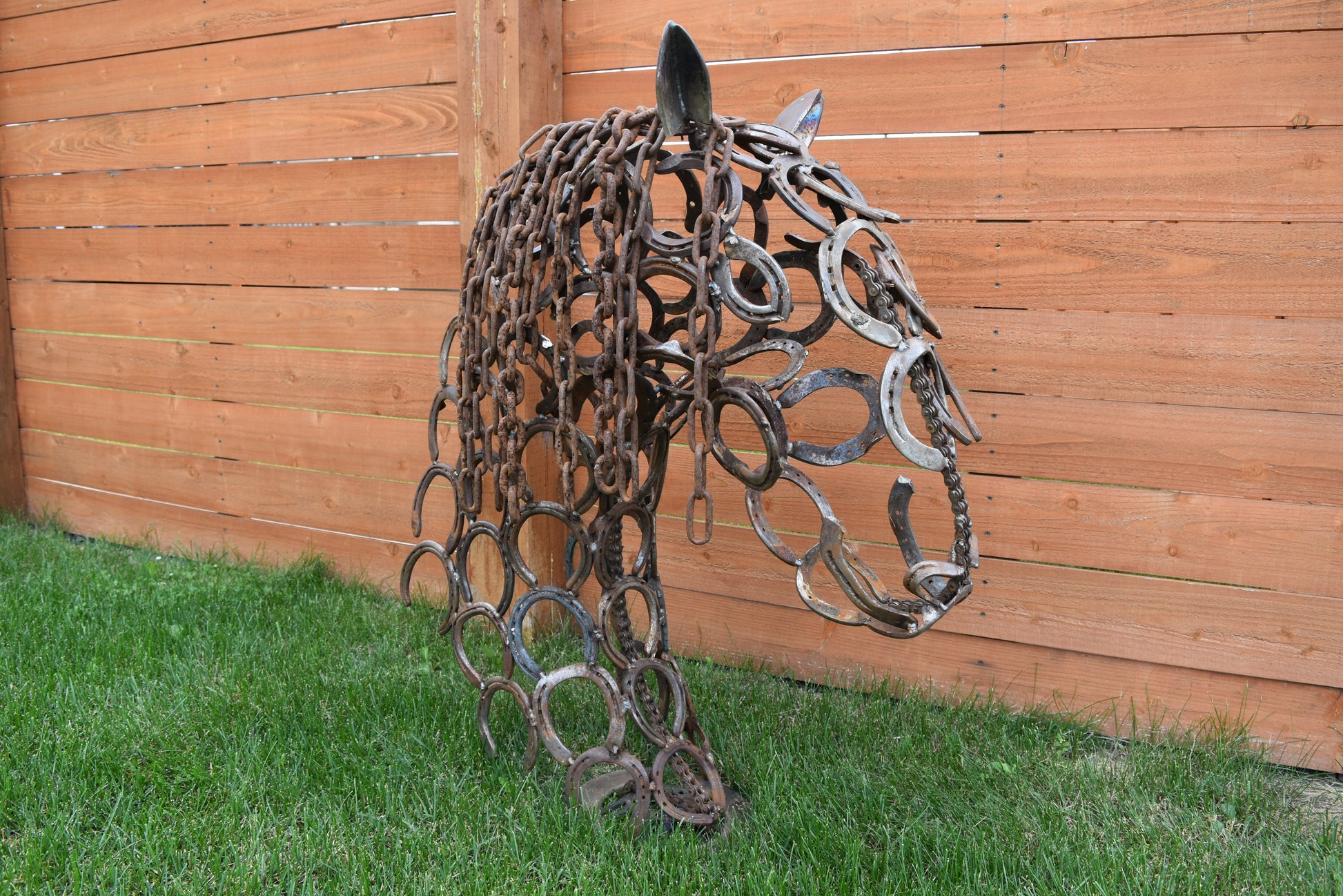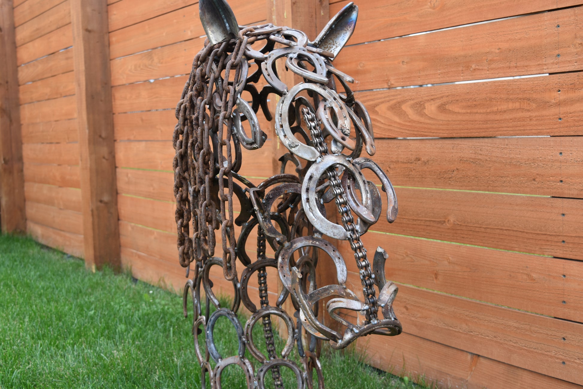 At Spearhead we support young local artists who creatively find a way to re-purpose history. This one of a kind 3D Horse head silhouette was made from authentic horseshoes. Creatively welded together and will accent any ranch house, next to fireplace hearth, or any modern decor. We cannot say enough about these works of art. What we love the most are the caulkins or studs that the artist left behind. Caulkins were added to horseshoes to enhance traction on slippery surfaces like ice or mud. 42 inches tall and 32 inches in length. Welded on a brake disc, the mane is made of chains. It is 39 kilos of wonderful art.