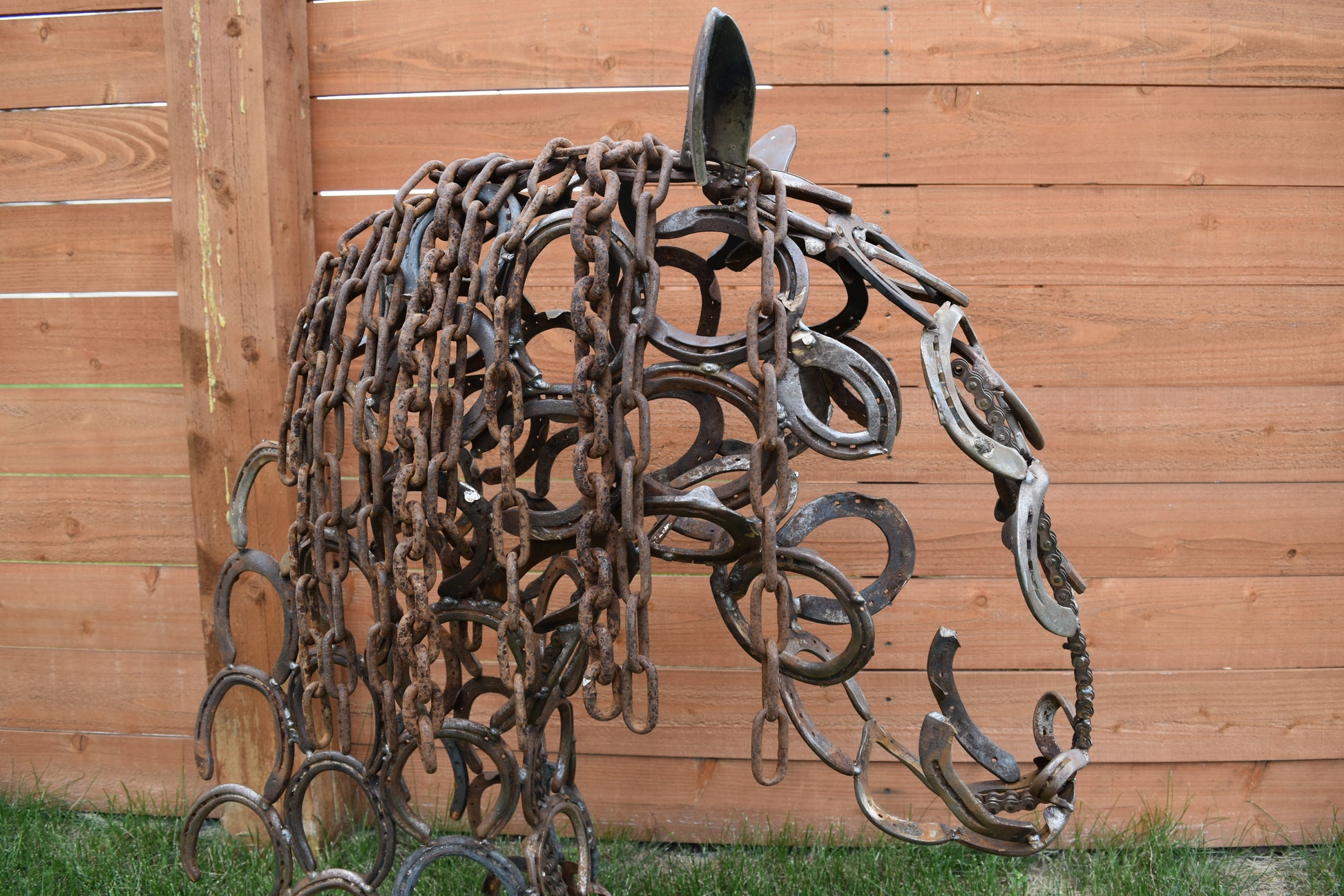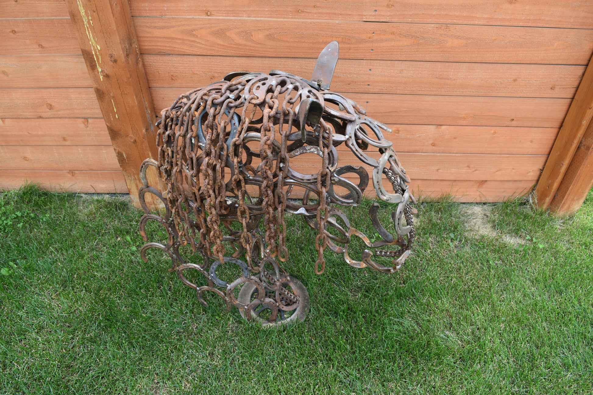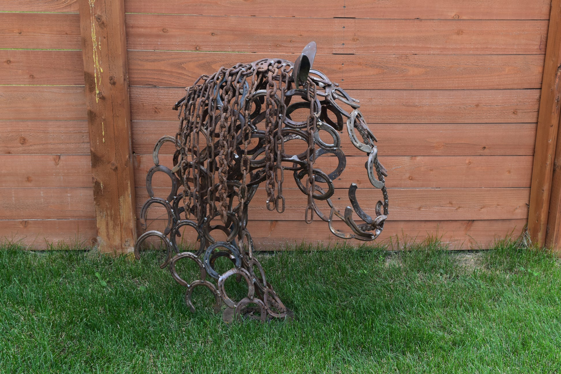 At Spearhead we support young local artists who creatively find a way to re-purpose history. This one of a kind 3D Horse head silhouette was made from authentic horseshoes. Creatively welded together and will accent any ranch house, next to fireplace hearth, or any modern decor. We cannot say enough about these works of art. What we love the most are the caulkins or studs that the artist left behind. Caulkins were added to horseshoes to enhance traction on slippery surfaces like ice or mud. 42 inches tall and 32 inches in length. Welded on a brake disc, the mane is made of chains. It is 39 kilos of wonderful art.