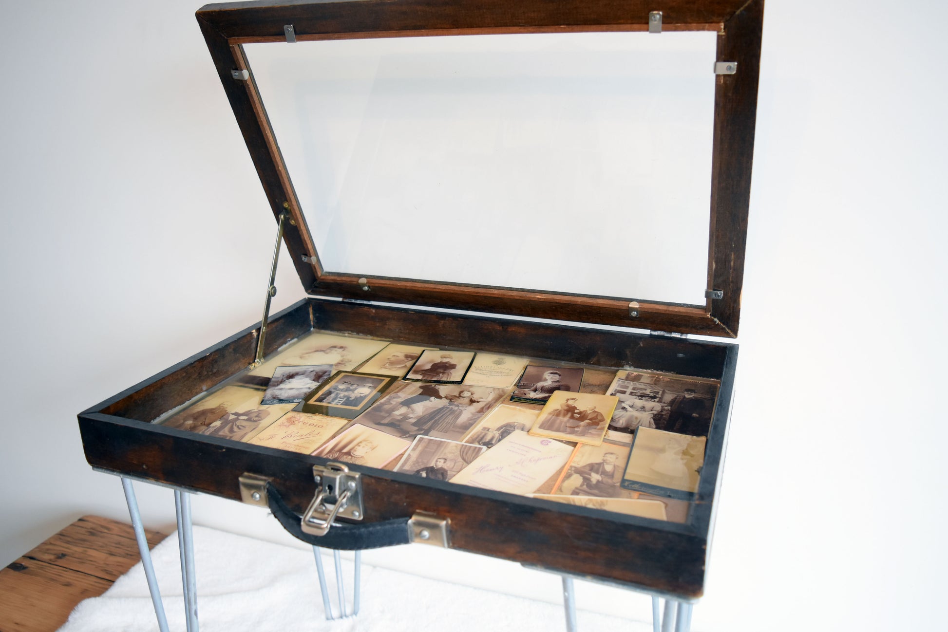 This display box is a perfect home for memories of old. The suitcase handle, latch and hairpin legs really brought the character of the piece to life. We hope you enjoy the combination of wood and nickel, but we also hope you enjoy thinking about the photographs that line the inside of this side table.
