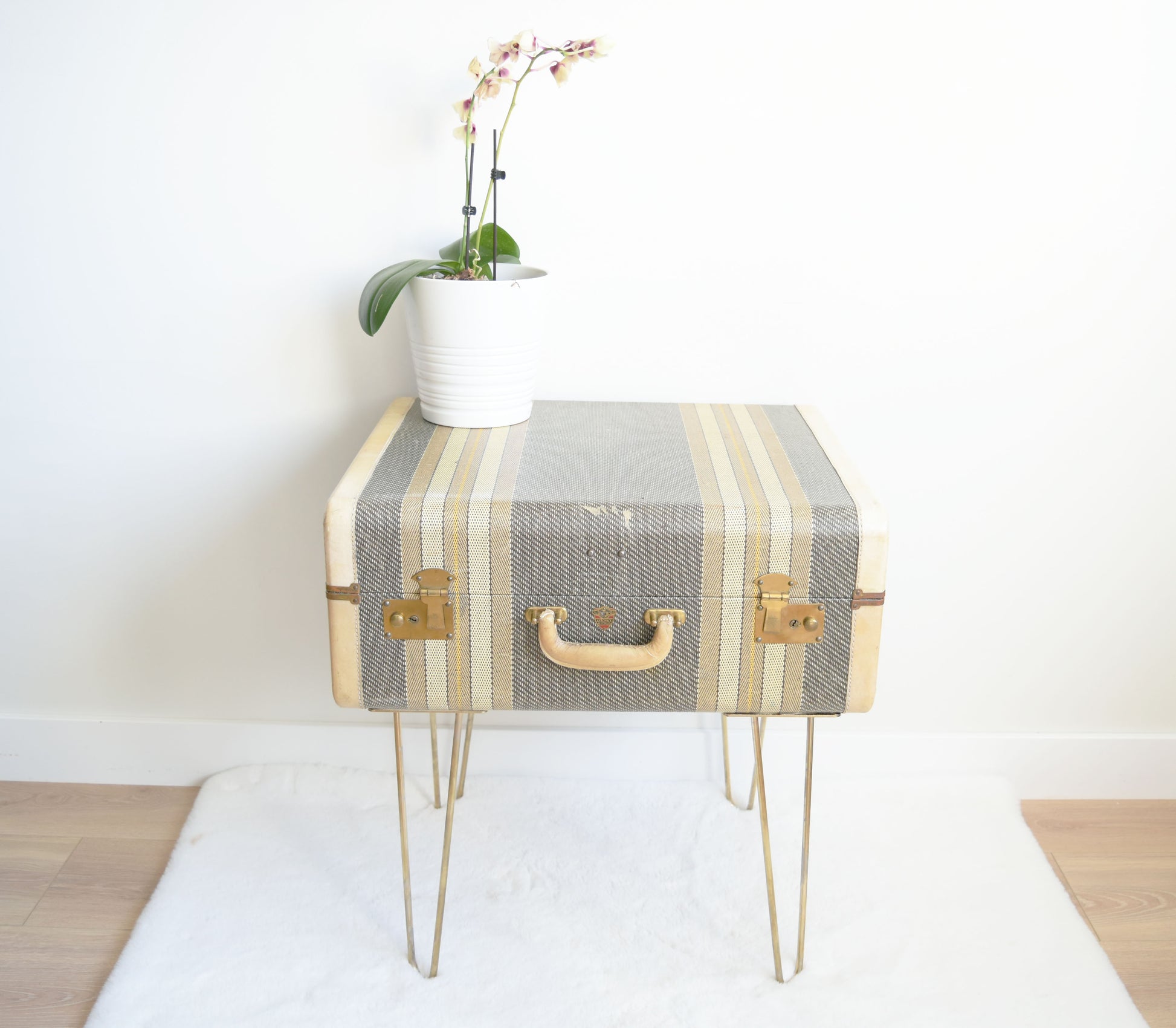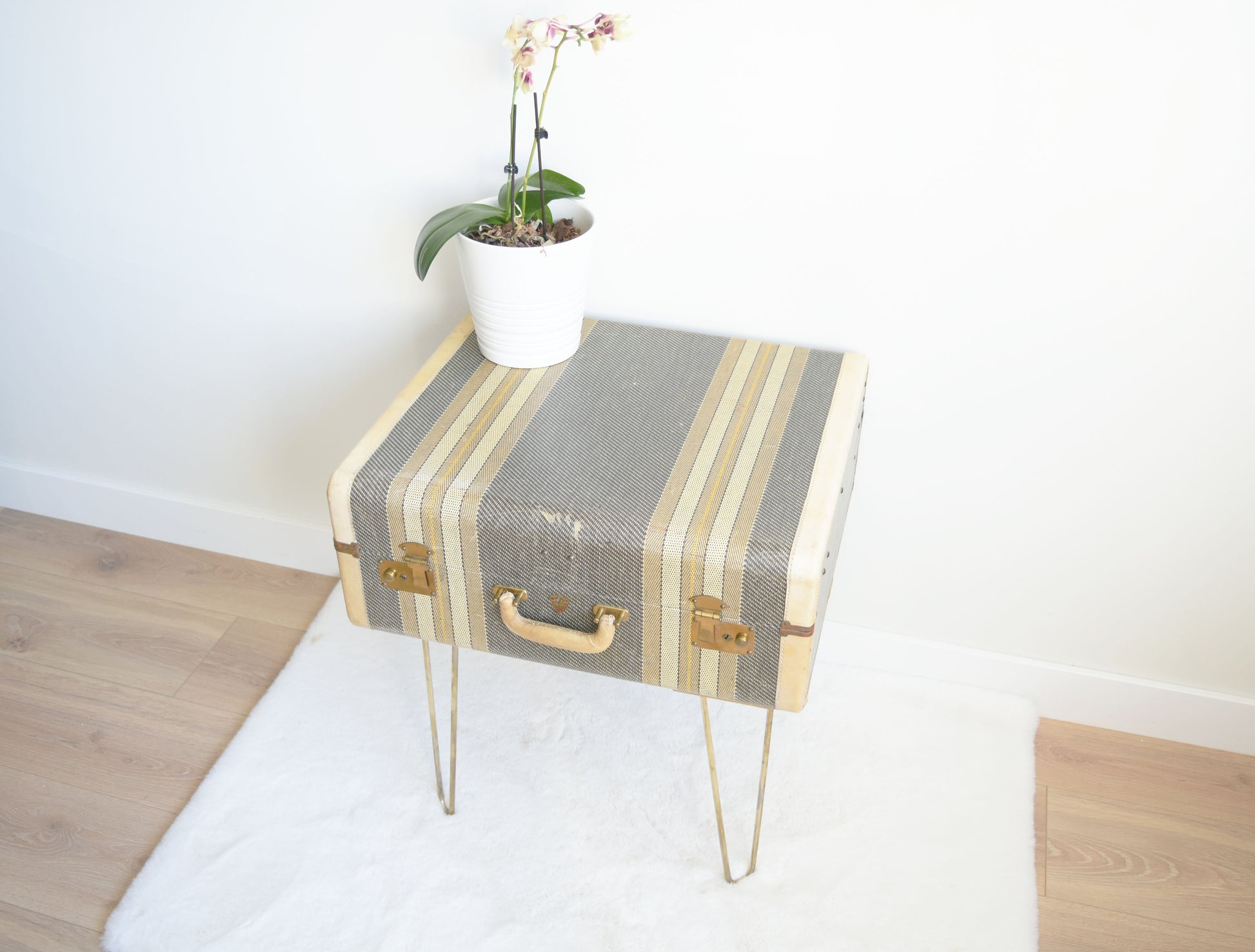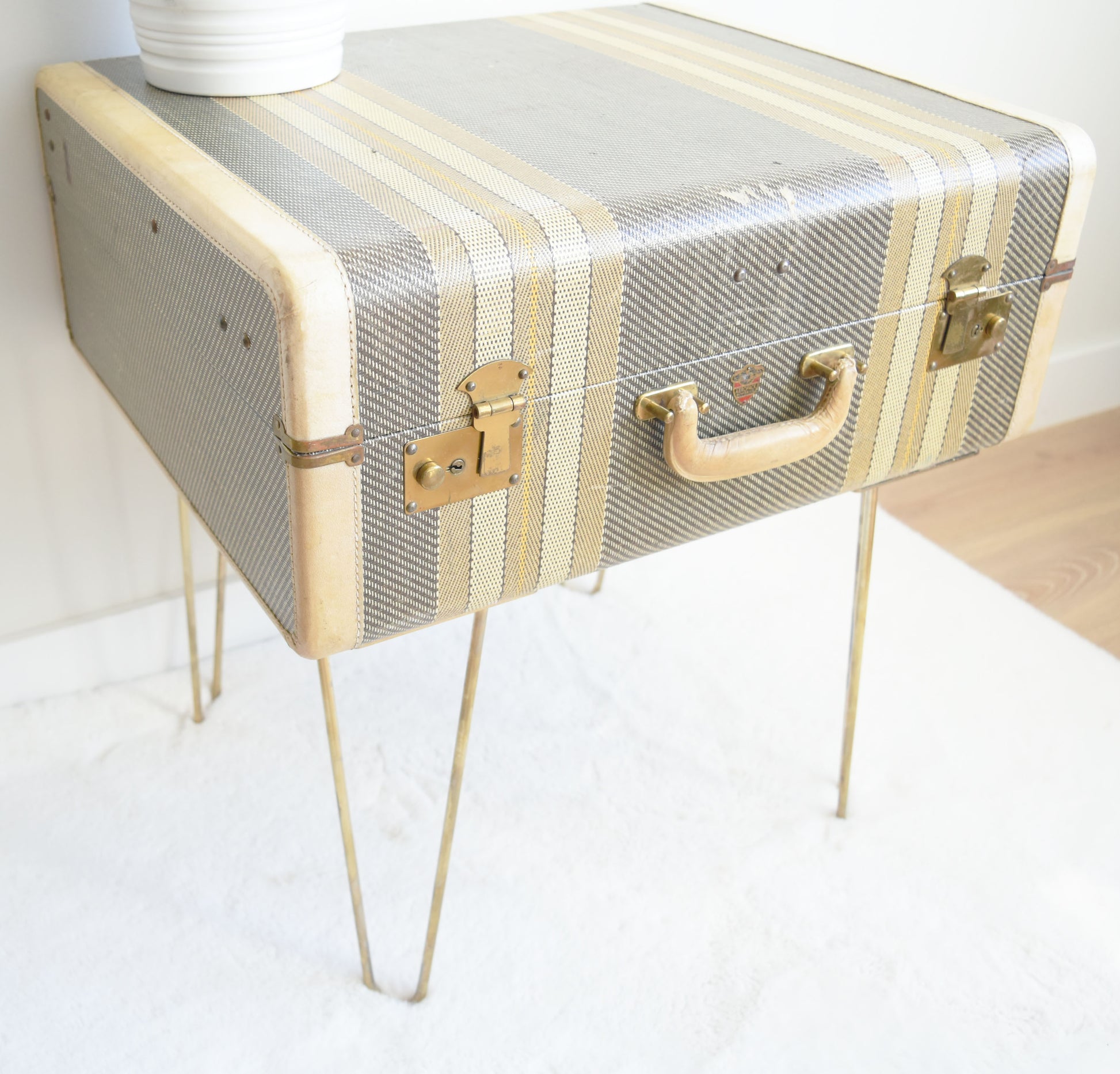 The strips of this gold suitcase table inspired the use of the brass hairpin legs. The inside of this vintage suitcase is intact and tells of more travel stories than we can imagine. We hope you enjoy this side table as it sits in that cozy and quiet corner of your house, where you remember your past travel memories.