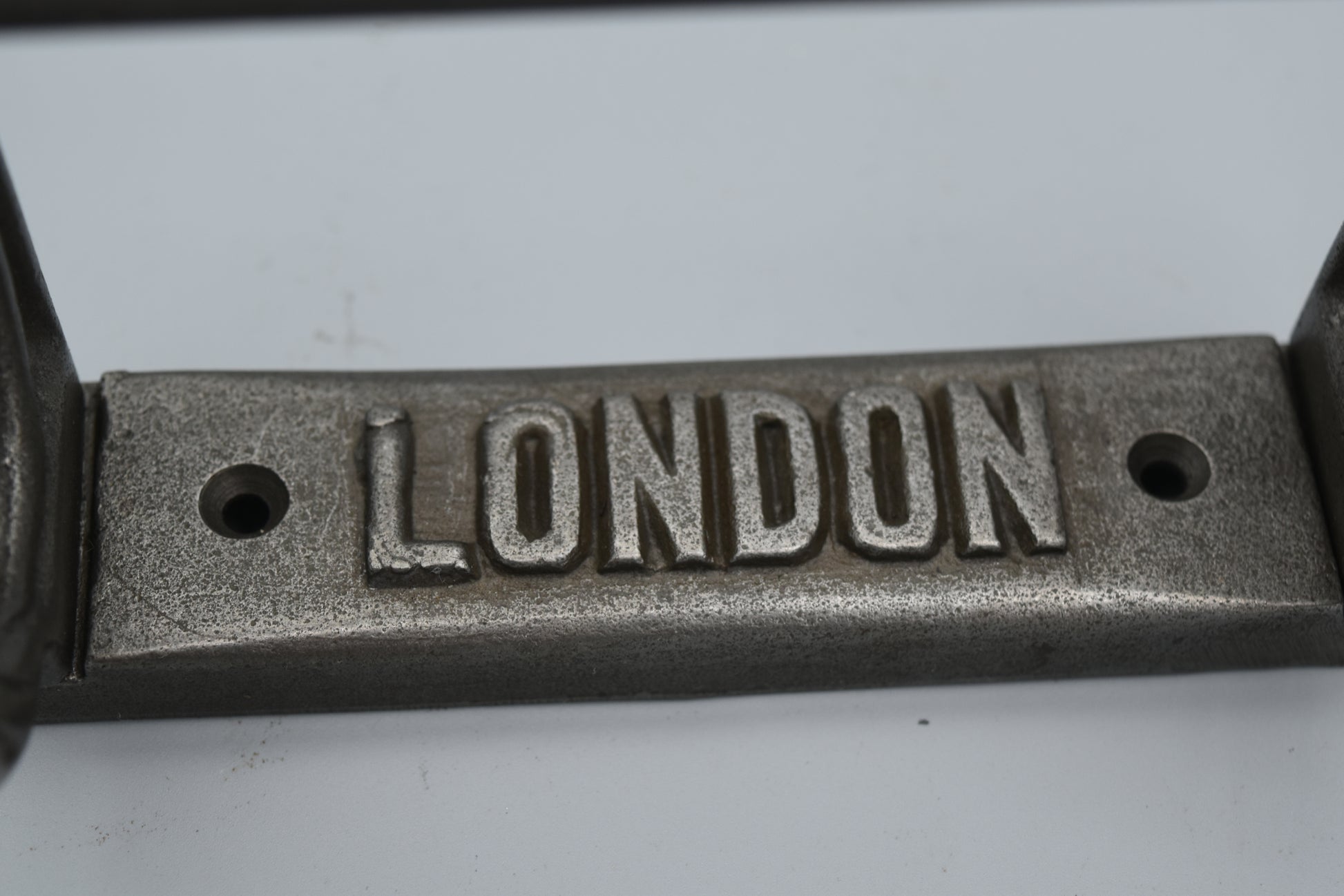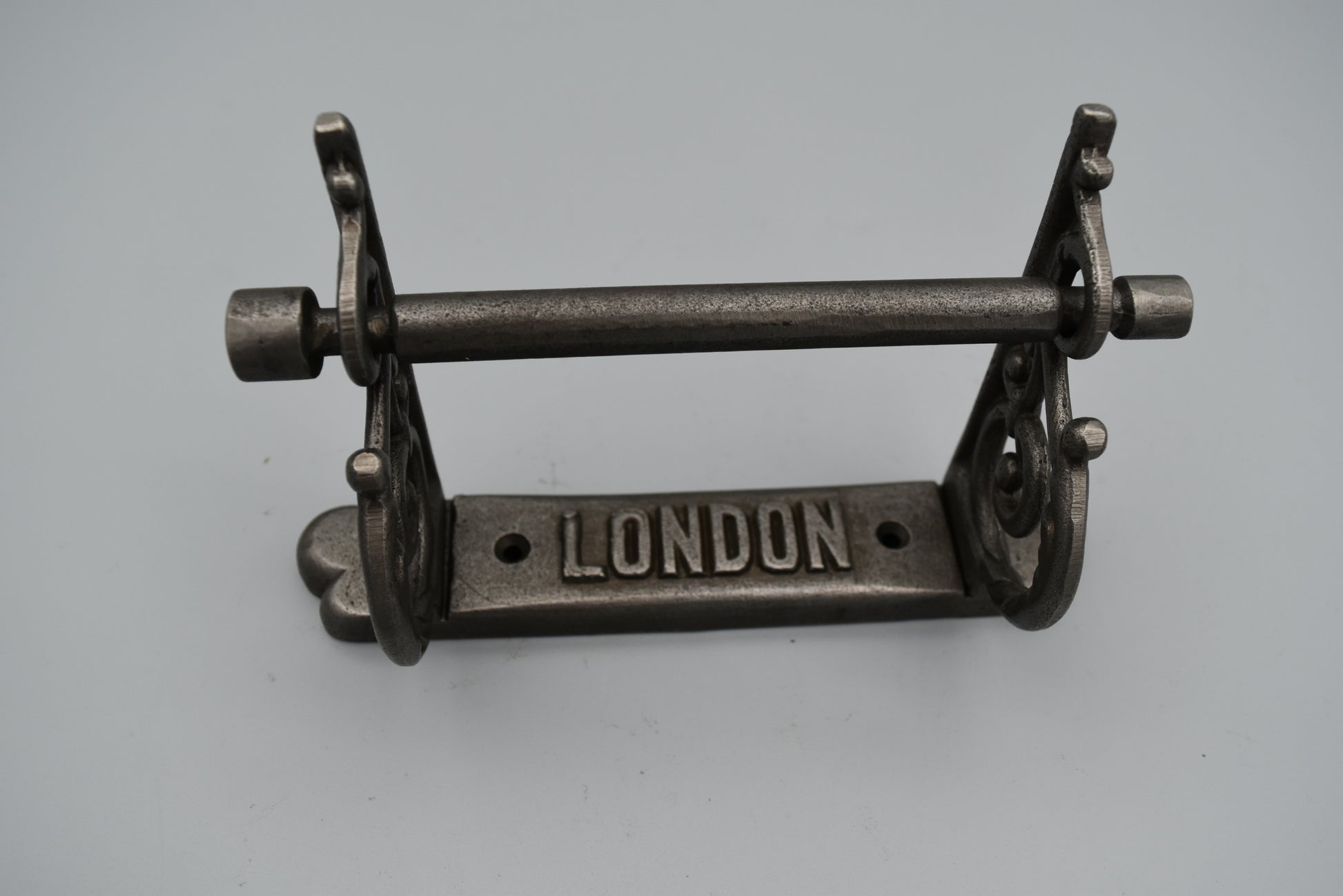 Cast iron, "Toilet" embossed, and natural antique iron finish this toilet paper holder combines functionality, traditional looks and durability.