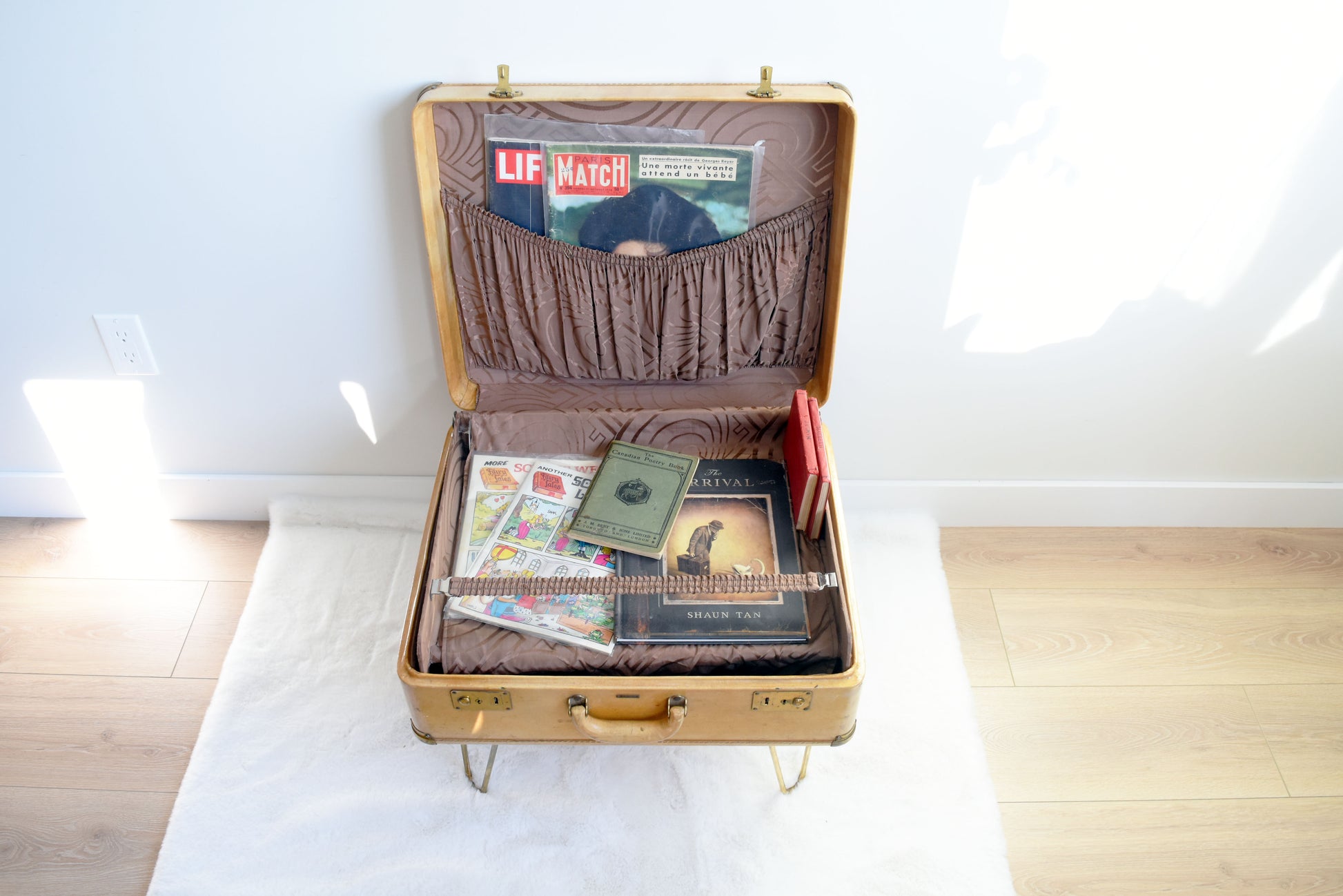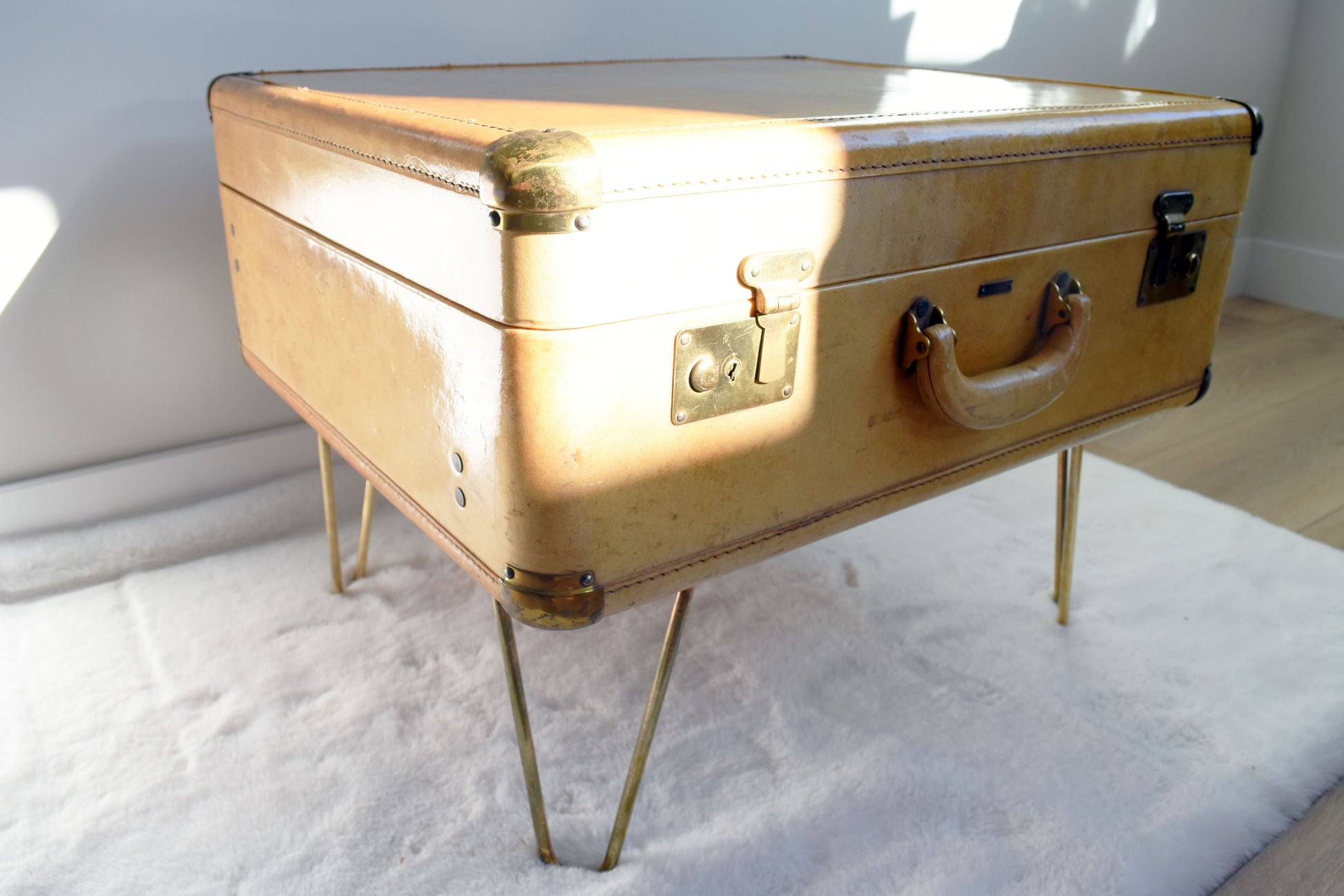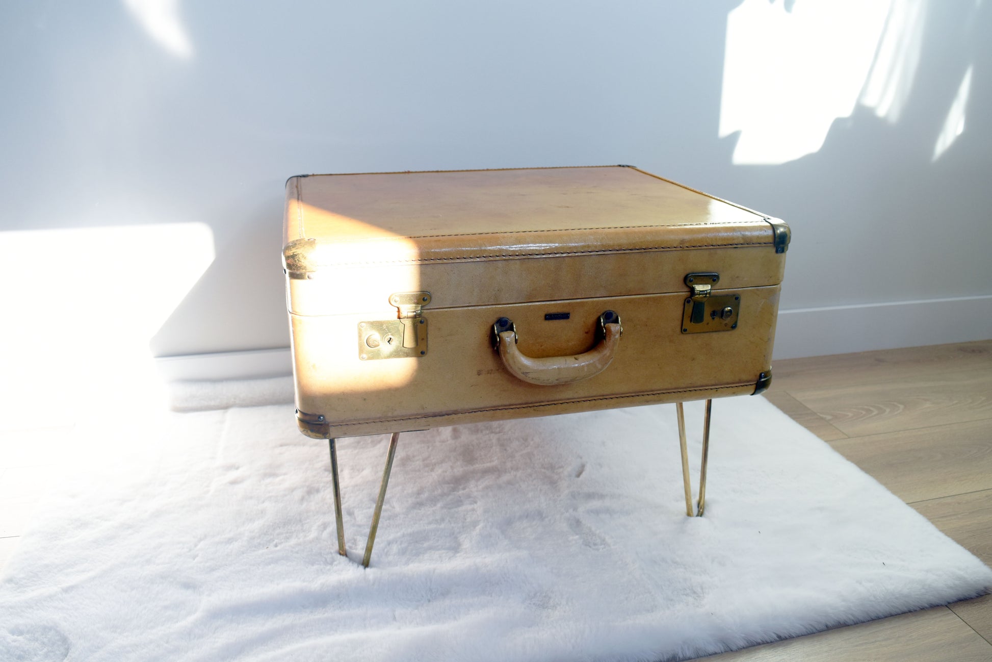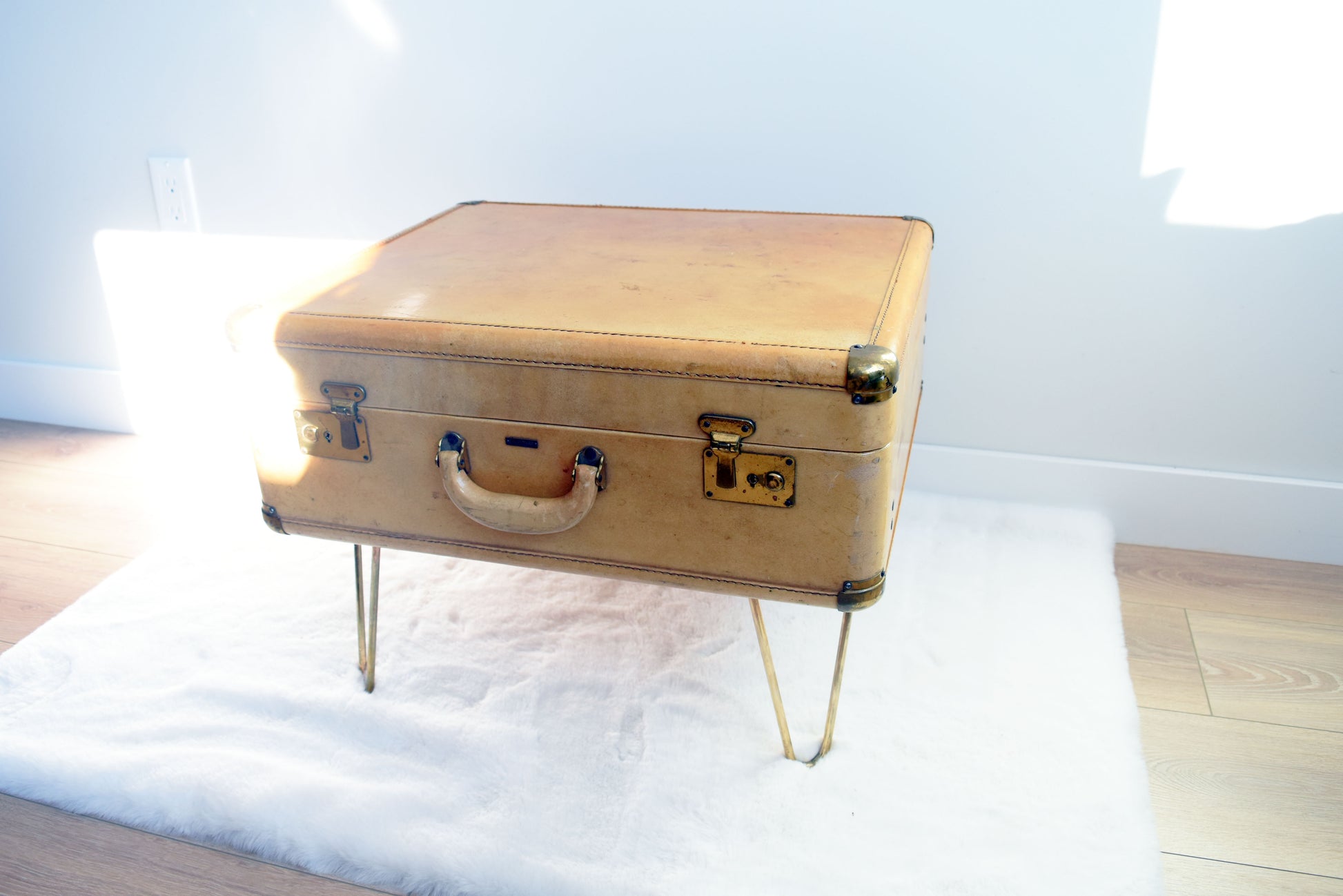 The brass corner protectors and locks are easily accented by the brass hairpin legs. This unique coffee table would look great in any small space.